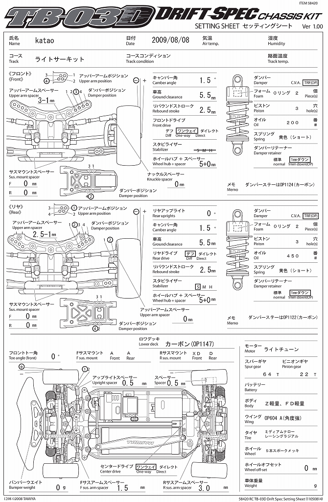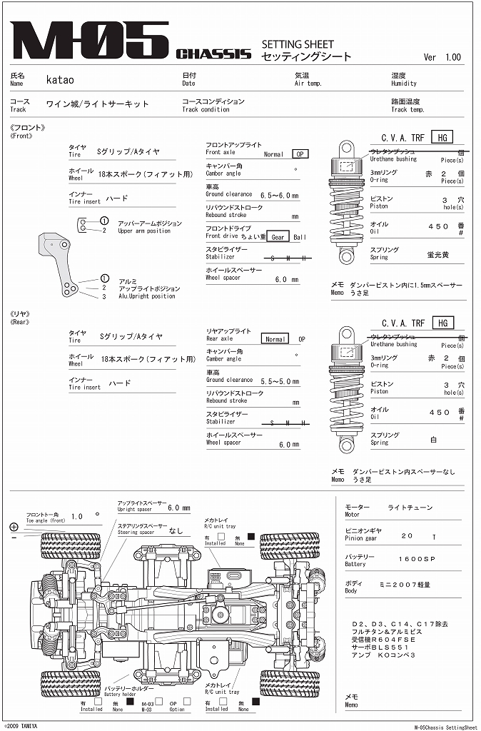 土曜日のライトサーキットでの走行で良い感じで走れましたので、 タミチャレには大幅な変更は無いと思います。 明日はM05を作ってみたいと思います ![]() ボディは2種類を使いましたが、Zの方がクイックでした。 |